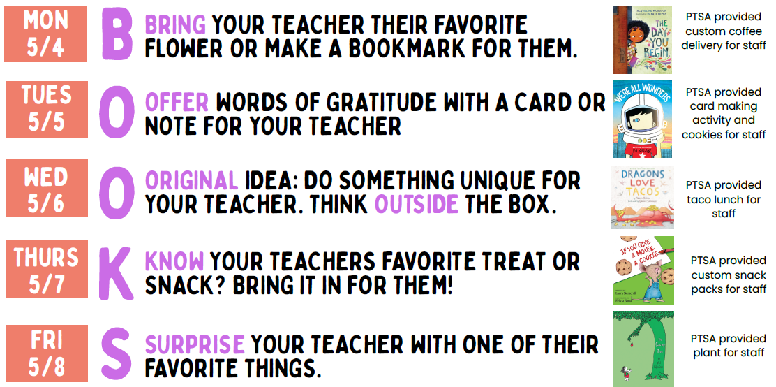 -Monday 5/4: B: Bring your teacher their favorite flower or make a bookmark for them (*PTSA provided coffee delivery)