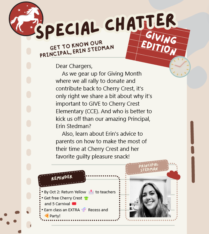 The Cherry Crest Charger Chatter is emailed to families and staff on Tuesday mornings. Read our submission guidelines