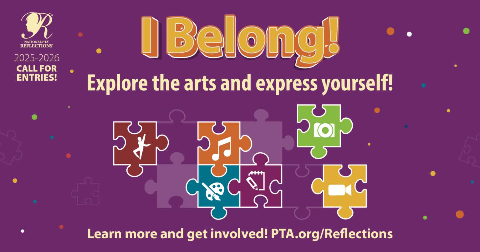 Reflections Program Reflections Art Program 2025 This year’s theme is: “I Belong”The Reflections Program is a National PTA arts competition for students from pre-K through grade 12. The purpose is to provide an opportunity for students to use their creative talents by expressing themselves through their own original works of art in response to a theme.2025-2026 Submission Deadline: Nov 14th, 2025The winners’ artworks will be advanced to the Bellevue Council level and have a chance to advance to the state and national level. This year is more exciting as the in-person art show is returning: all submitted pieces will be displayed at the school and have a chance to be voted as the “fan-favorite” piece!Please use the guidance in the attached file when submitting your artwork -> Cherry Crest Art Reflections 2025-2026. Submission guidelinesLearn more about the Art Reflections Program:WA State PTANational PTAQuestions? Contact reflections@cherrycrest-pta.org2025-2026 Chair: Shanshan Ma