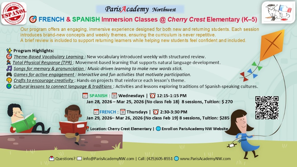 French & Spanish Immersion classes WINTER 2026 Title of Class: French & Spanish Immersion classes WINTER 2026 Day of week: Spanish on Wednesdays – French on ThursdaysTime of day: 12:15-1:15 PM – 2:30-3:30 PMStart and end dates: 📅 SPANISH Jan 28, 2026 – Mar 25, 2026 (No class Feb 18) 8 sessions📅FRENCH Jan 29, 2026– Mar 26, 2026 (No class Feb 19) 8 sessionsLocation: (classroom to be assigned)Cost: SPANISH $270 / FRENCH $285Registration Window: 1/5/2026-1/20/2026 Contact Person & Contact Info. ParisAcademy Northwest (425)605-8551 –info@ParisAcademyNW.com No late registration accepted.All participating students and their parents must be PTSA members to enroll in the program. Sign up to be a PTSA member here, or the student may lose their registration spot. If the registration capacity is reached, students with no other after-school program registered will have priority. If we still have a waitlist, we will do a fair lottery. The successful registered students will receive a payment link. Vendor reserves the right to cancel the program if the minimum enrollment numbersCherry Crest reserves the right to cancel the program if there is an issue with broken/missing items in the classroom, or if no parent volunteer is present at each session.